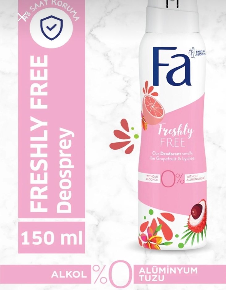 Fa Freshly Free deodorant sprey, greyfurt ve liçi kokusuyla 48 saat koruma sağlar. Alkol ve alüminyum tuzu içermez, 150ml boyutundadır.
