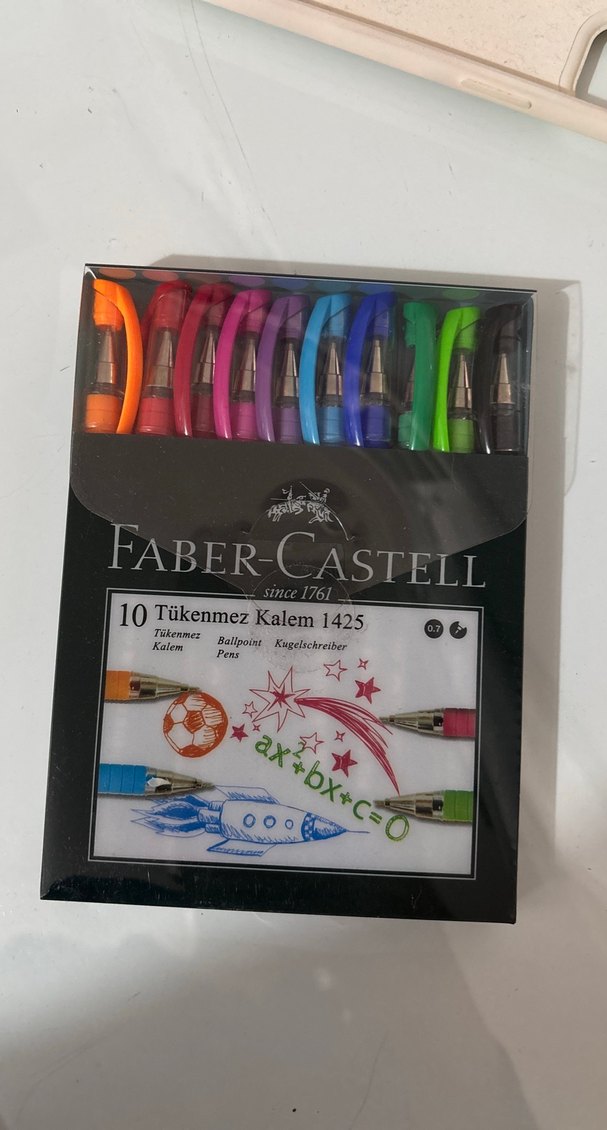 Faber-Castell'in 10 renkli tükenmez kalem seti, yazı ve çizim için canlı renkler sunar. ✏️