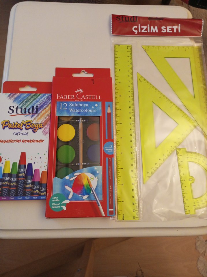 12 renk Faber-Castell suluboya, pastel boyalar ve cetvel ile üçgenlerden oluşan çizim seti. Canlı ve açık renkler içerir.