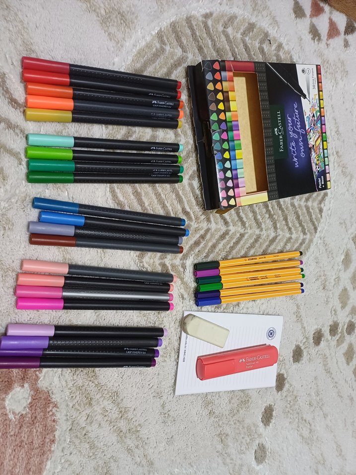 Faber-Castell renkli kalem ve keçeli kalem seti, çeşitli canlı renkler, kalemtraş ve silgi içerir. Detaylı çizim ve yazı için uygundur. ✏️