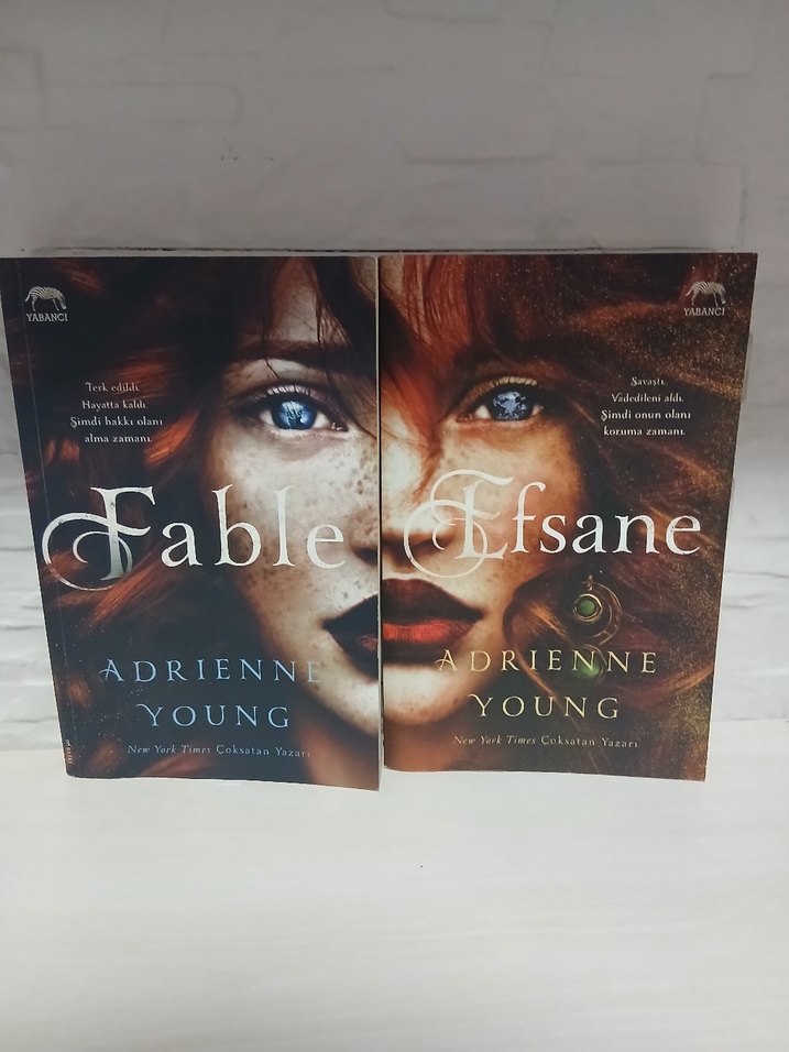 Adrienne Young'un "Fable" ve "Efsane" adlı romanları, mavi gözlü bir kadının yakın çekim portrelerine sahip kapaklarla sunuluyor. geldiği gibi aynıdır sadece bir cümle çizilidir.