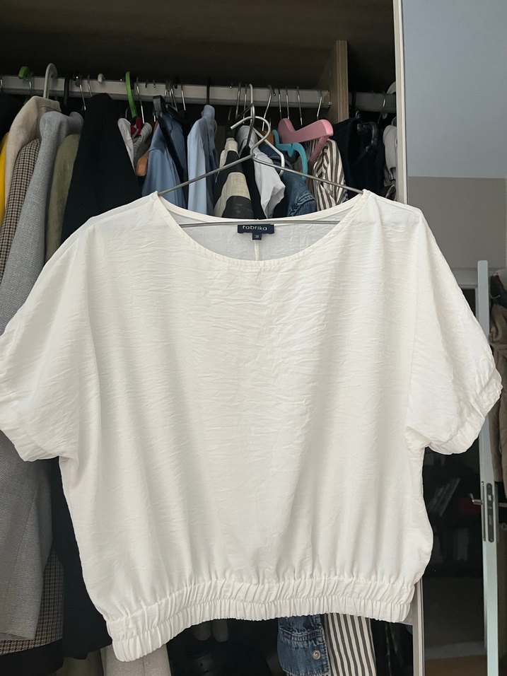 Kısa kollu, yuvarlak yakalı beyaz bluz. Salaş kesimi ve normal boyuyla günlük rahat kullanıma uygundur, zahmetsiz şıklık sunar. Ütü istemez bel ve kollar kalın lastikli crop tarzında