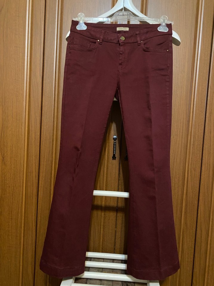 Fabrika marka, Bordo renginde, İspanyol paça, likralı pamuk kumaştan denim pantolon. Kemer britli ve 5 cepli, esnek kumaşıyla çok rahat olduğu gibi yüksek topuklarla çok şık da görünüyor. 40 beden, ölçüleri fotolarda mevcuttur.