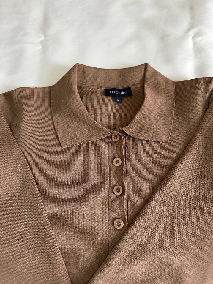 Bej rengi crop boyunda düğmeli, yakalı ve uzun kollu hırka.