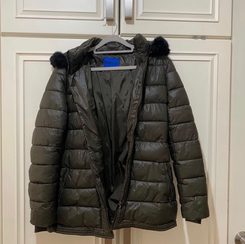 Gri renkli, kadınlara özel, kürklü kapüşonlu, normal uzunlukta, soft sentetik kumaştan yapılmış, sokak stiline uygun, fitted kesim kışlık mont.