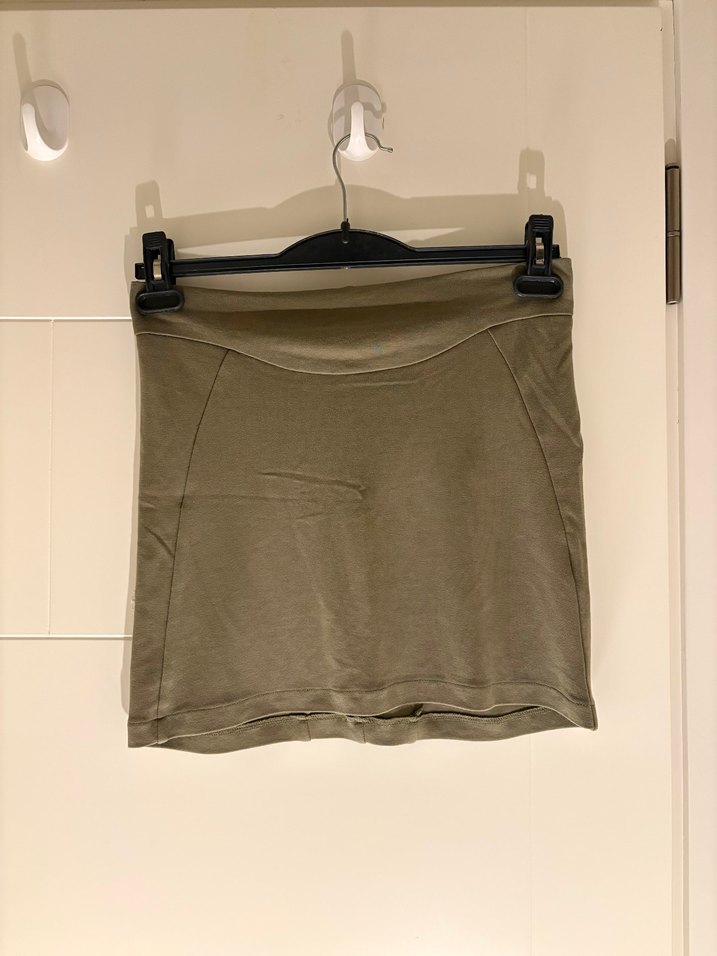 F002 Ürün İçeriği: 80% viskoz 15% polyester 5% elastan Haki/gri penye kumaş mini etek. Sadece 1-2 kere giyildi.