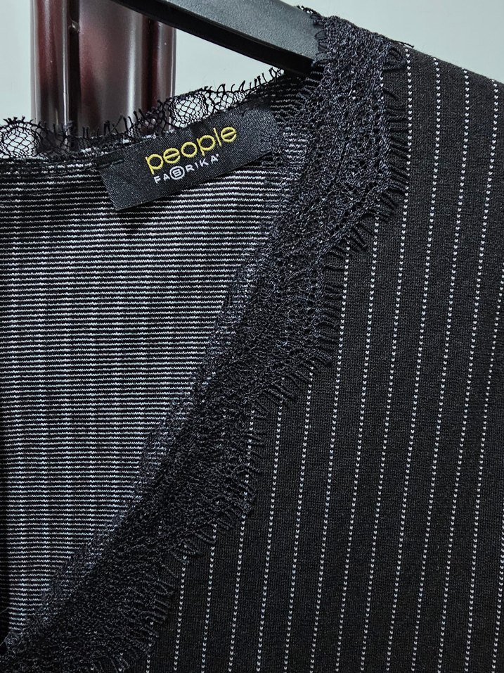 Siyah çizgili V yakalı ve dantel detaylıdır. Yarım kollu, uzun ve regular fit kesimlidir. Fabrika marka etiketi yok ancak bir kez bile kullanılmadı sıfır üründür. Likralı yapısı vardir ve kumaşı duruşu çok çok kaliteli tam bir Fabrika marka ürünüdür.