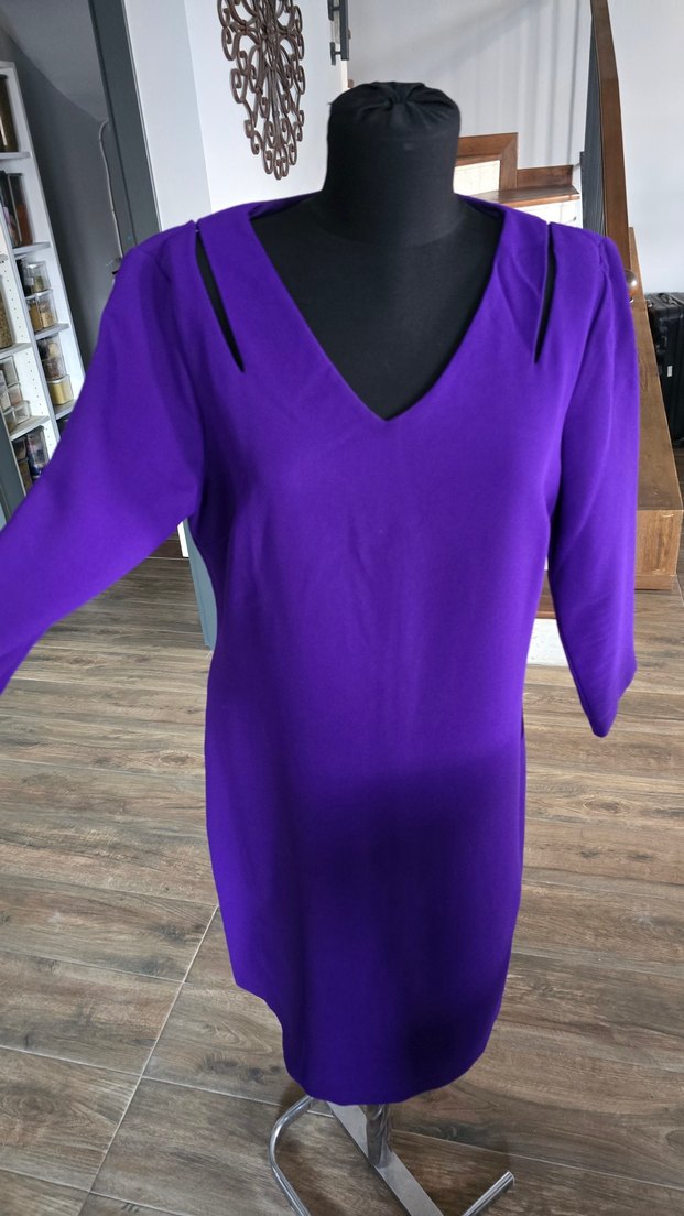 Fabrika Marka Mor renkte, V yakalı ve uzun kollu midi elbise. Dökümlü, bol kesimiyle minimalist ve çağdaş bir tarza sahip, romantik akşamlar için uygun. omuz detaylu