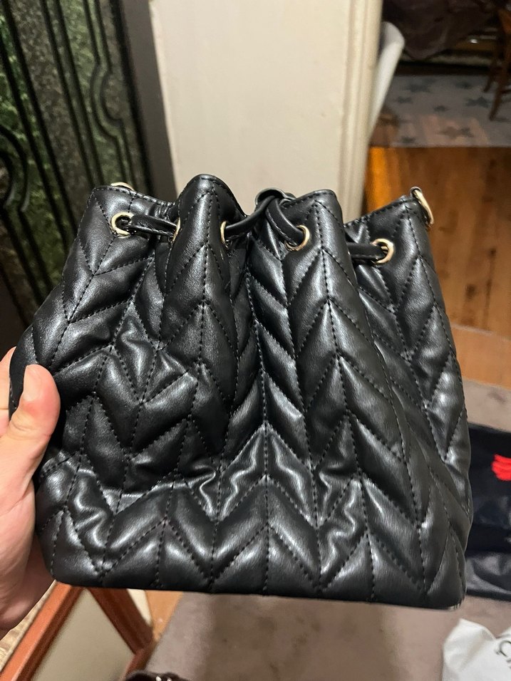 Siyah deri, kemerli ve kapitone desenli çanta, günlük kullanıma ve sokak stiline uygundur.