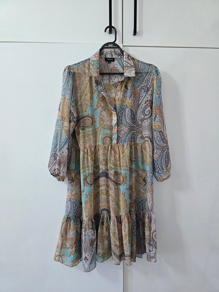 Bol kesim, uzun boylu, yakalı ve düğmeli kadın tunik. Yumuşak sentetik kumaştan, pastel çok renkli paisley desenli. Askılı kollar ve akışkan siluet, günlük kullanım için uygun.