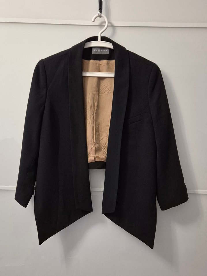 Siyah kadın blazer, notched lapel ve yetim kollu, ceket kumaşı, arka kısa ön uzun üçgen kesim Midi boy, ofis ve sokak stiline uygundur. Önde gizli cep mevcut. Astarında tek yerde ütü lekesi oluştu. Son görselde görebilirsiniz.