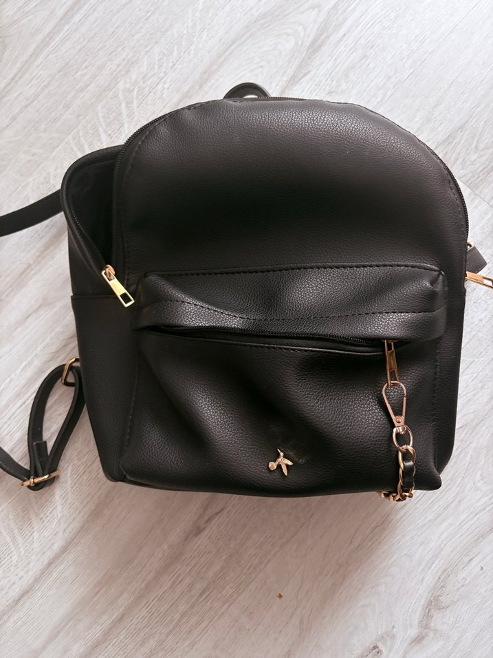 Fabrika marka. Siyah deri kadın sırt çantası, omuz askilarindan birinde acilma var, dikis atilmasi gerekecektir. On kucuk cepteki astar yapistirma oldugu icin atmis, onun da yapistirilmasi gerekebilir. Bunun disinda herhangi bir sorunu yok.
