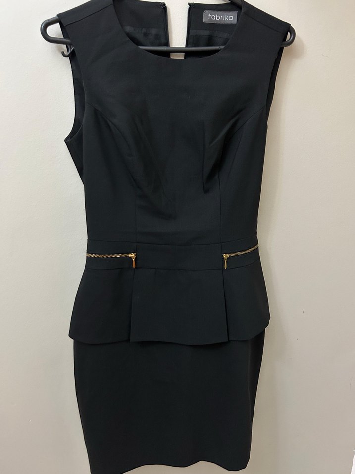 Siyah, yuvarlak yaka ve kolsuz tasarıma sahip, fermuarlı detaylı, vücuda oturan mini ofis elbisesi.
