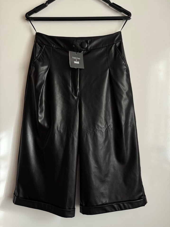 Siyah deri, bol kesim bermuda boy şort. Çok şık, günlük ve ofis kombinlerine uygun. Askıda katlı durduğu için hafif iz olmuş ama kullanıldıkça geçiyor.