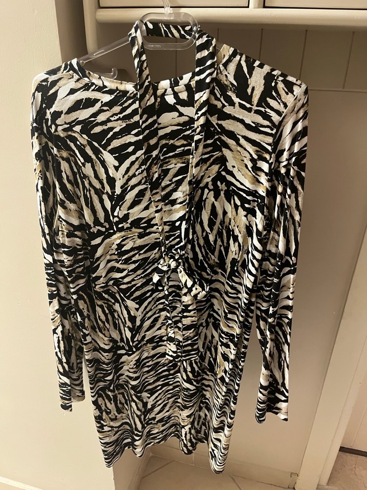 Dar kesim, uzun kollu, zebra desenli kadın penye elbise.