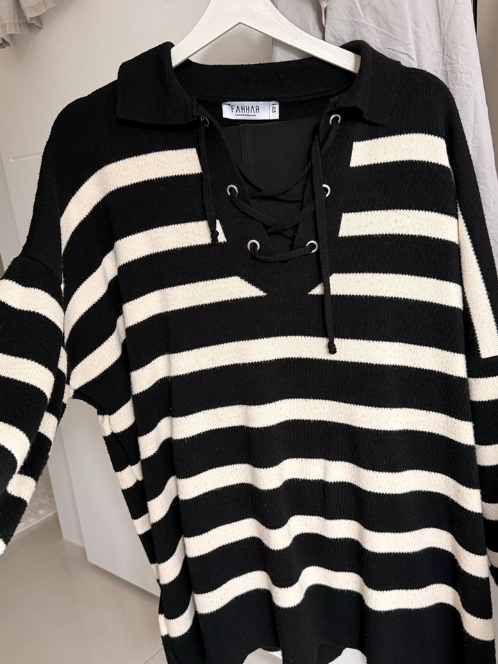 Siyah-beyaz çizgili, örgü dokulu, yakalı ve bağcıklı detaylı, rahat kesim sokak stili kadın kazak. Fahhar marka /standart
