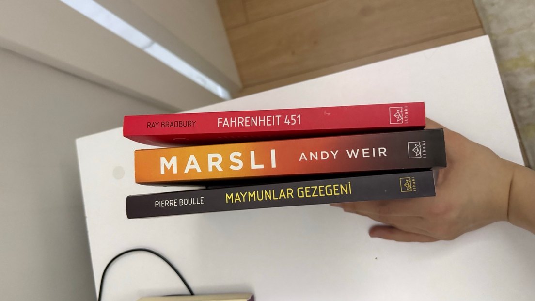 Bradbury'nin Fahrenheit 451, Andy Weir'in Marslı ve Pierre Boulle'un Maymunlar Gezegeni kitapları seti.