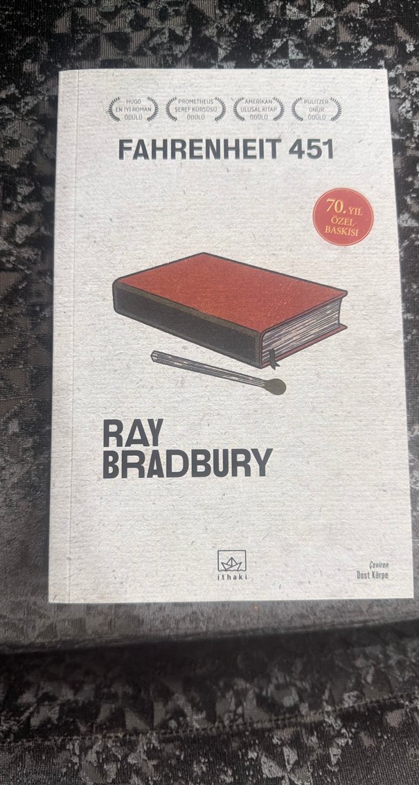 Ray Bradbury'nin Fahrenheit 451 adlı eseri, 70. yıl özel baskısı. Kitap ve kibrit resmi bulunan sade kapak.