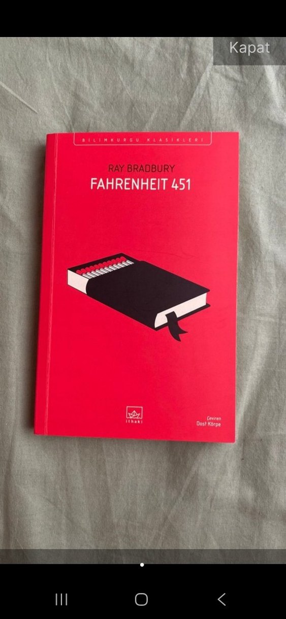 Ray Bradbury'nin Fahrenheit 451 adlı klasiği, sansür ve bilgi korunması temalarını işler. Kapağı kırmızı ve kitap şeklinde bir kibrit kutusu çizimi bulunur. içinde birkaç altı çizili sayfa bulunur