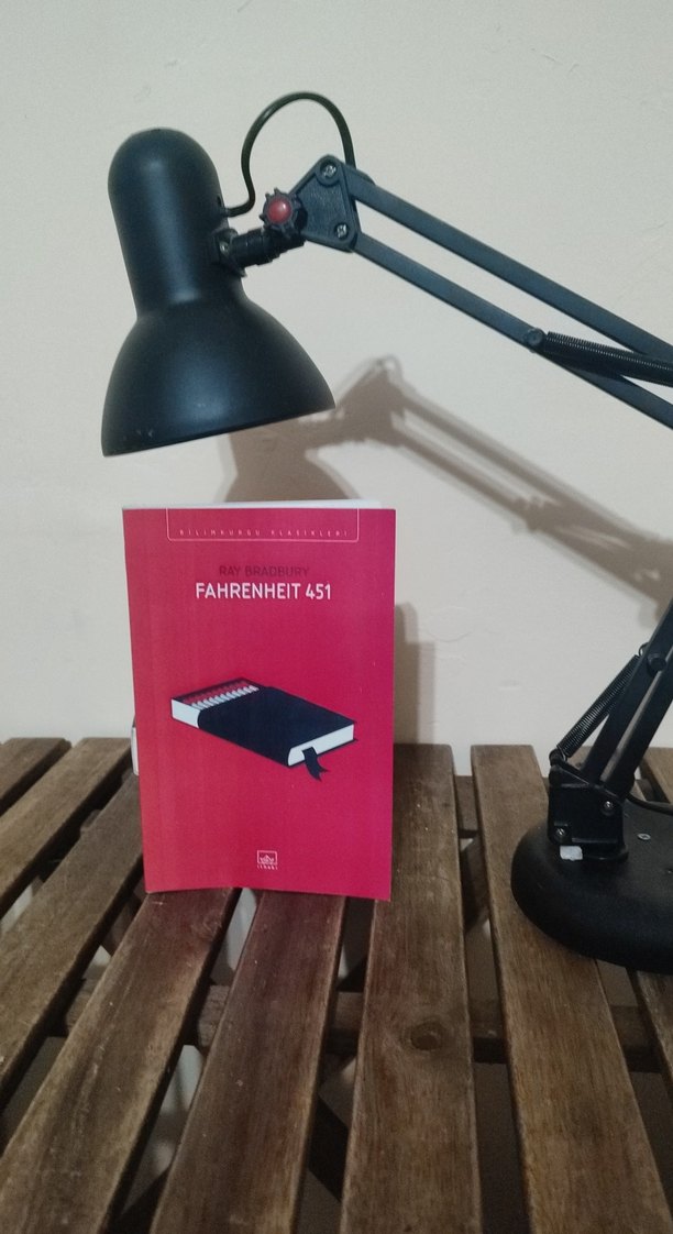 Ray Bradbury'nin Fahrenheit 451 kitabı, kitapların yasaklandığı ve yakıldığı distopik bir geleceği anlatır. Kapağı kırmızı ve kibrit kutusu resmi bulunur.