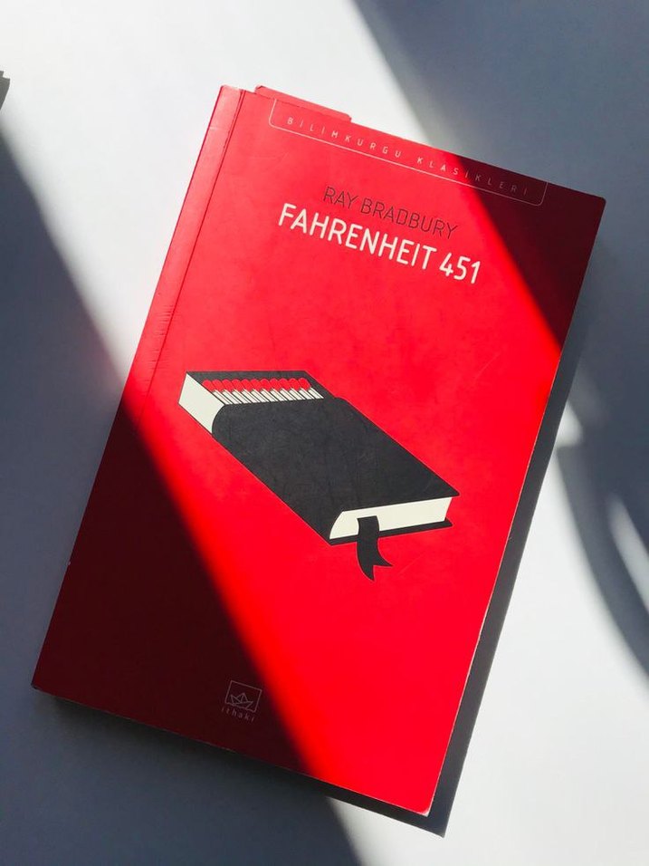 hic okunmadi sifir Ray Bradbury'nin Fahrenheit 451 adlı romanı, sansür ve kitapların gücü üzerine klasik bir eser. Kapağı kırmızı kibrit kutusu ve siyah kitap çizimi içerir.