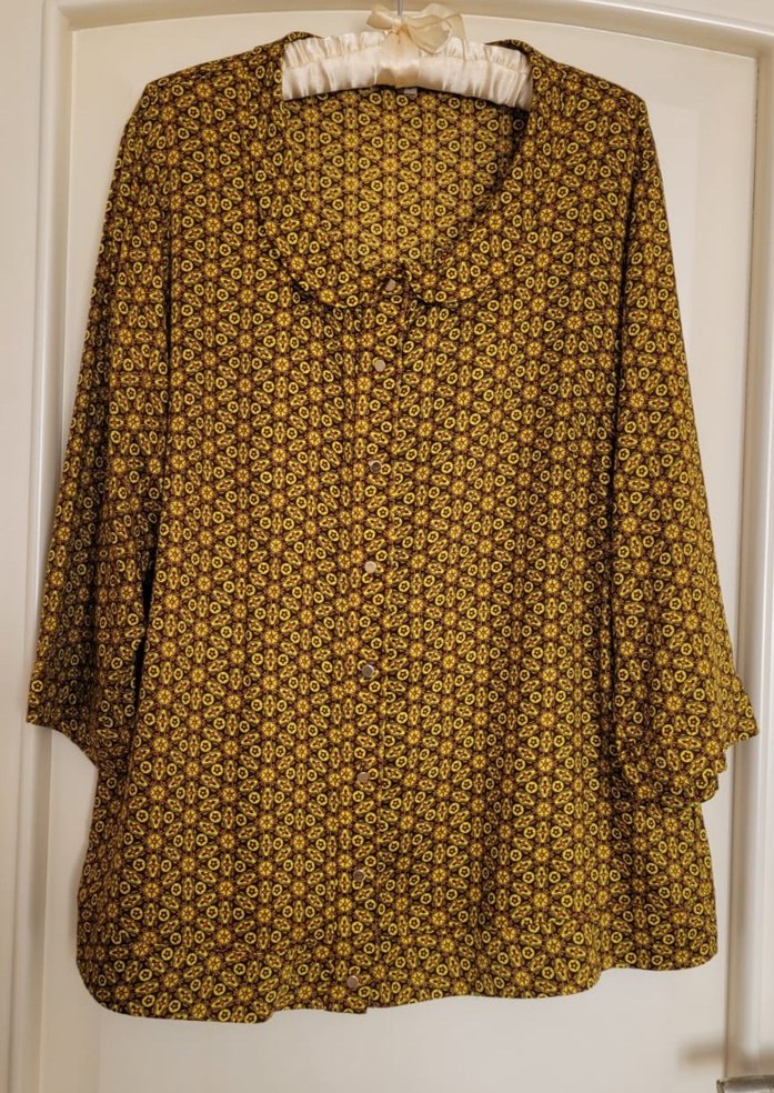 Faik Sönmez hardal renkte, düğmeli, 3/4 kollu, bebe yakalı ve bol kesim bohem tarzı gömlek. İpeksi dokusu rahatlık sağlar. %100pamuk canlı orjinal bir parça iki kol arası 58cm, boyu 68cm 46-48beden olur #büyükbeden #faiksönmez #bluz #gömlek #bebeyaka