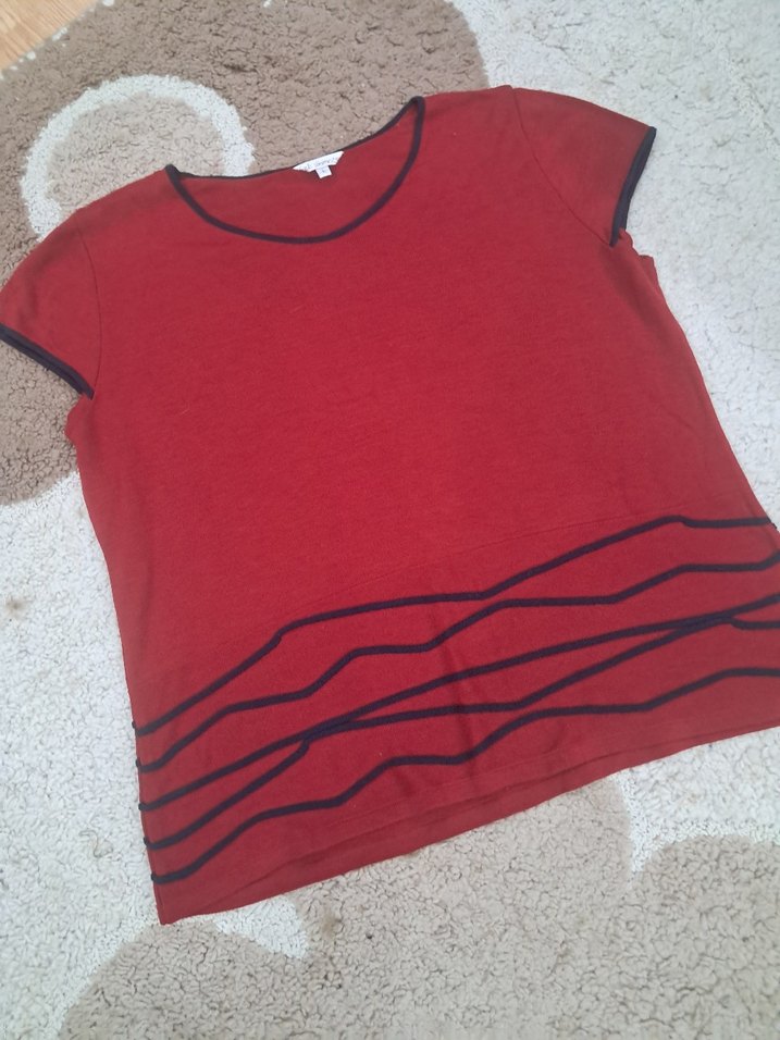 Kırmızı k kısa kollu, yuvarlak yakalı, bol kesim kadın tişörtü. Alt kısmında baskılı detaylar bulunur, günlük kullanım için uygundur. yepyeni