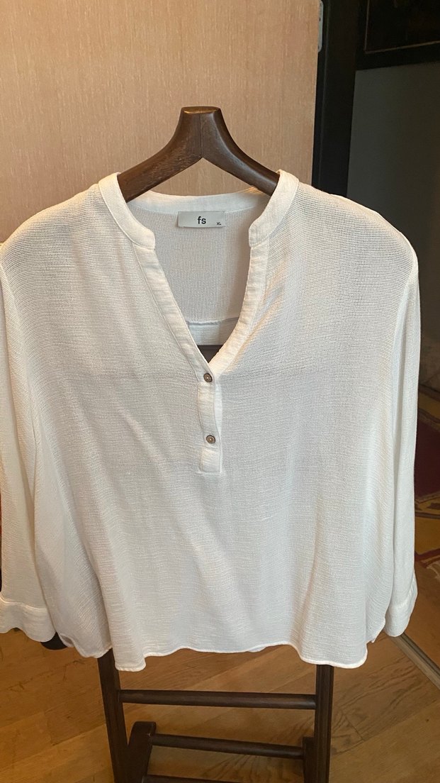 Kullanılmamış keten kumaştan, bol kesim, uzun kollu ve V yakalı gömlek. Düğmeli ön kısmı göğüs ölçüsü 68 cm ön boy 67 cm. Arka boy 72 cm. Geniş kalıp. 52 bedene kadar uyumlu
