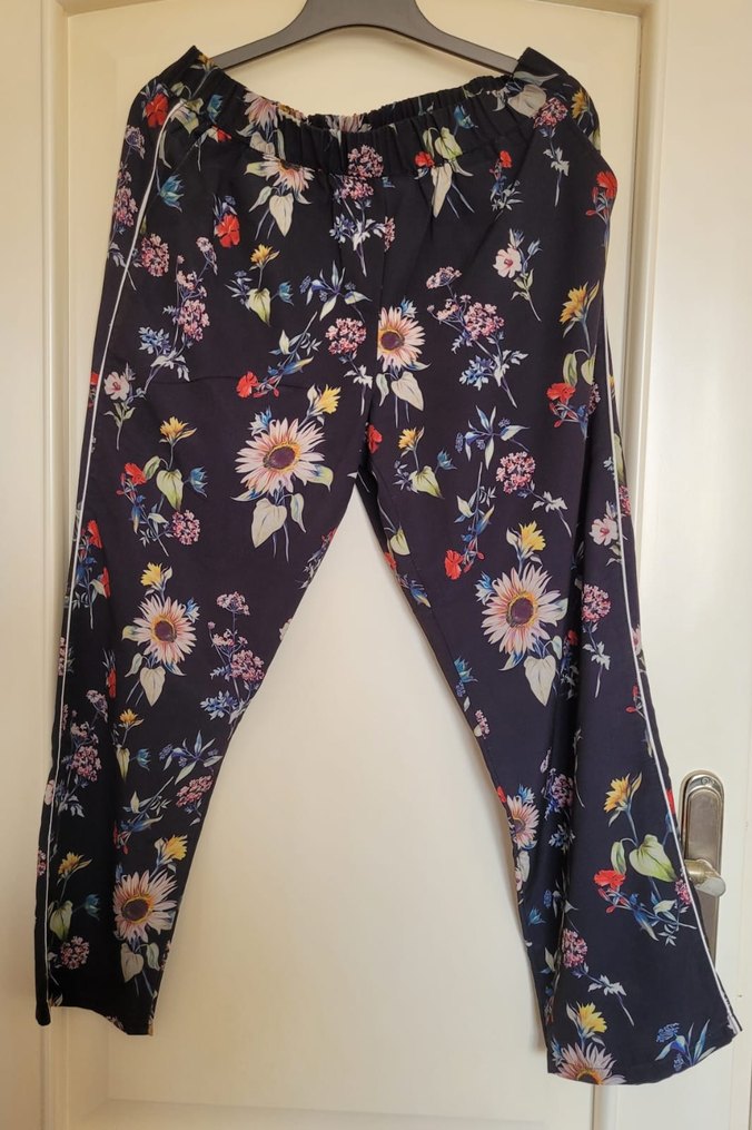 Faik Sönmez çiçek desenli, bol kesim beli lastikli, tiril tiril pantolon, yanlarda beyaz şeritli, sentetik kumaştan, günlük sokak stiline uygun rahat bir model, beli 40cm, boyu 90cm #faiksönmez #pantolon #çiçek #lastikli