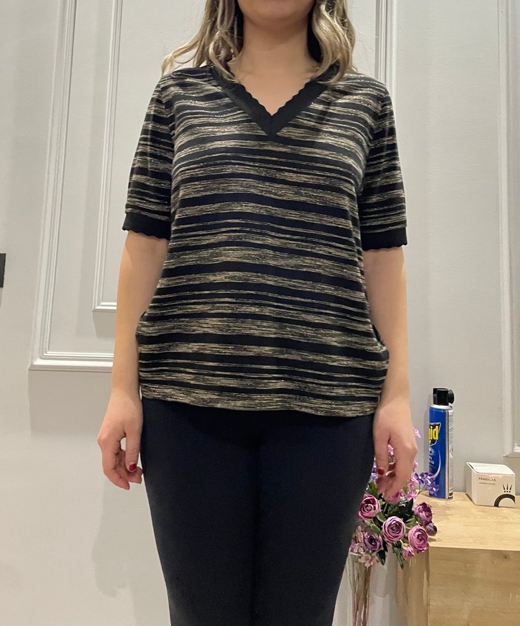 Kahverengi, uzun kollu, v yaka, desenli ve ışıltılı triko. Kendi el örgüm hiçbir defosu yok, sıfır. İlk defa fotoğraf çekmek için giydim. Ben M beden giyiyorum M/L/XL olur