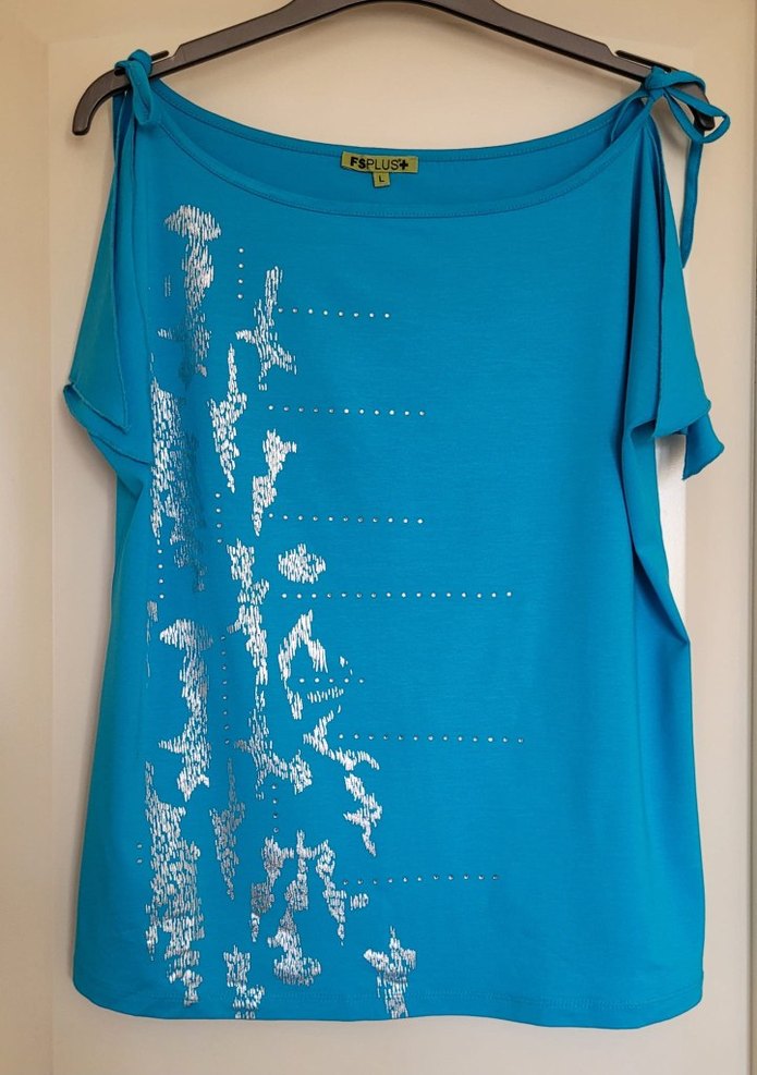 Faik Sönmez mavi parlak baskılı ve taş süslü omuzdan ip aski ile bağlanan çok şık bluz,bohem avant-garde tarzda, iki koltuk altı arası 55cm, boyu 54 cm, #faiksönmez #mavi #parlak #bluz