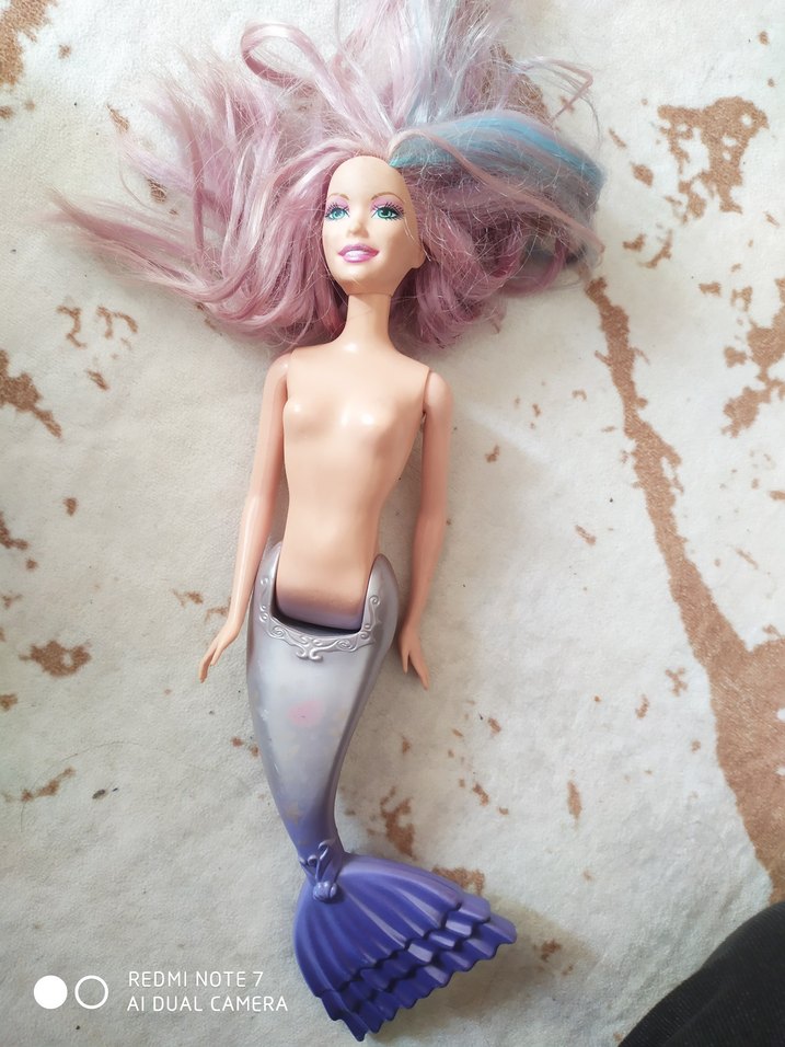 Pastel pembe saçlı deniz kızı bebeğin uzun saçları ve mor tonlarında detaylı kuyruğu vardır. Fotoğrafta 'REDMINOTE7, AI DUAL CAMERA' yazısı görünmektedir. ♀️