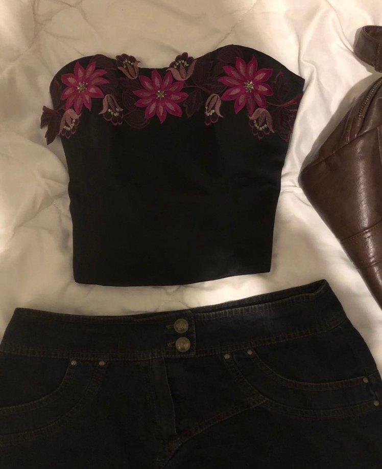 Bordo renkte, nakışlı çiçek detaylarına sahip, düğmeli ve kot kumaştan yapılmış, straplez ve vücuda oturan mini büstiyer. ✨