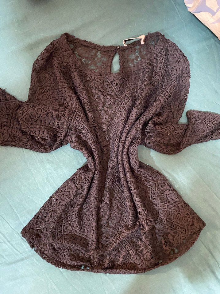 Mango Fairycore Y2K Siyah Dantel Bohem Bluz, bisiklet yaka ve dirseğe kadar uzun kolludur. Bohem tarzı, rahat kesim ve normal midi boyda, günlük ve gece kullanıma uygundur.