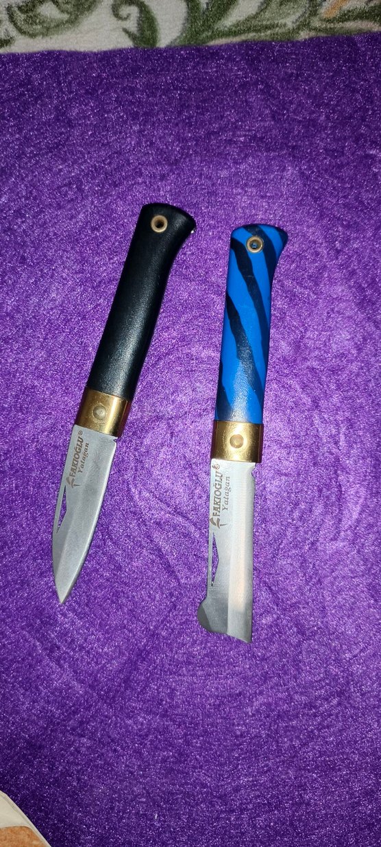 İki adet katlanır bıçak, biri siyah diğeri çizgili mavi saplı, paslanmaz çelik bıçaklara sahip. ️