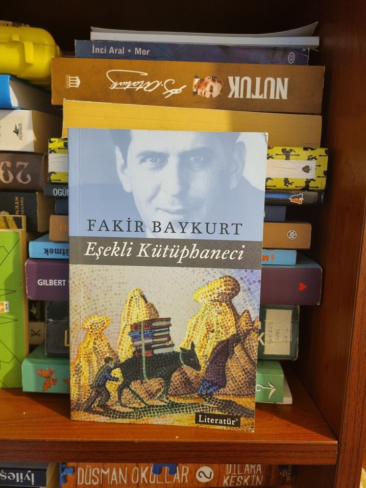 Fakir Baykurt'un 'Eşekli Kütüphaneci' adlı romanı, kitap taşıyan adam ve eşek görseliyle dikkat çekiyor. Edebiyat kategorisinde bir eser.