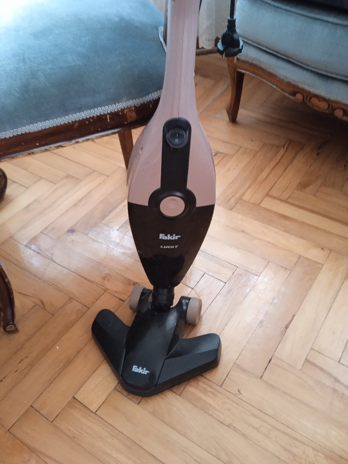 Fakir marka, bej renkli dikey elektrikli süpürge, koyu taban ve kompakt tasarıma sahiptir.