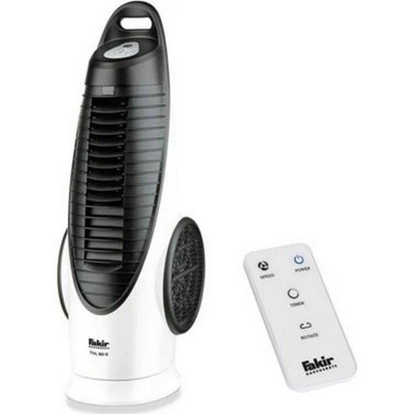 Fakir beyaz ve gri renklerde, uzaktan kumandalı vantilatör. Ayarlanabilir hız ve zamanlayıcı seçenekleri sunar. ️