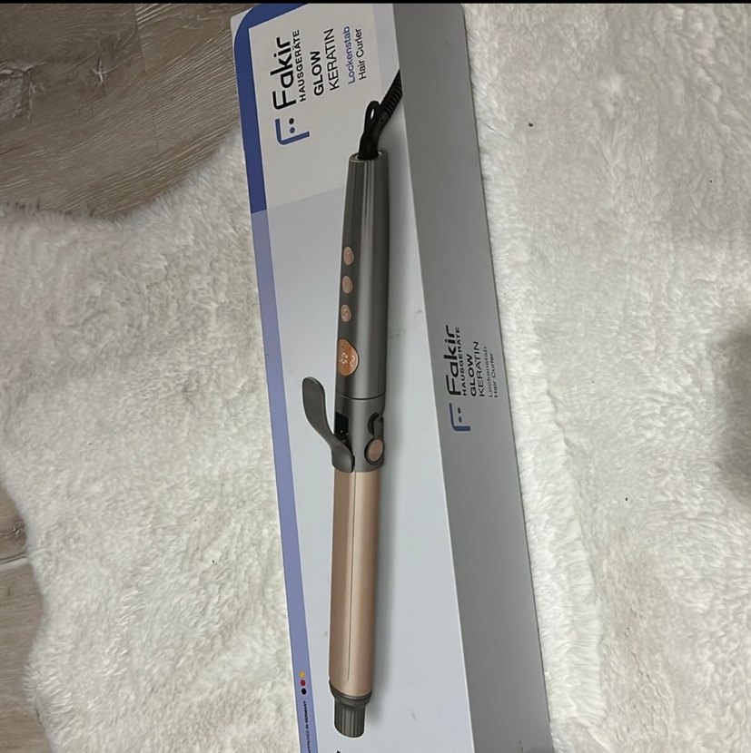 Fakir Glow Keratin saç maşası, gri ve bej renkleriyle şık tasarımı ve kullanımı kolay düğmeleriyle saç şekillendirmede kolaylık sağlar.