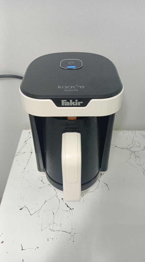 Fakir Kaae Mono kahve makinesi, beyaz gövde ve koyu renk üst kısmıyla dikkat çeker. Üstte tek tuşlu, kullanımı kolaydır. ☕