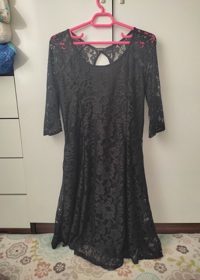 Komple dantel kaplama iç astarlı. Kolları dirsekte bitiyor sırtında dekolte mevcut. L beden. Göğüs 42 cm etek açıklığı 95 cm elbise boyu 90 cm. 1 kere mezuniyette kullanıldı bir problemi yok