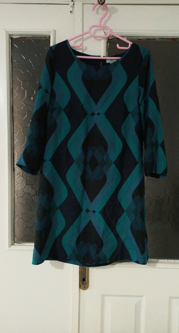 Turkuaz renkli bohem elbise, fakir kollu ve kayık yaka detaylıdır. Gevşek kesim ve drapeli tasarıma sahip, koyu batik desenlidir. Günlük kullanım için uygundur. astarsız bir elbisedir