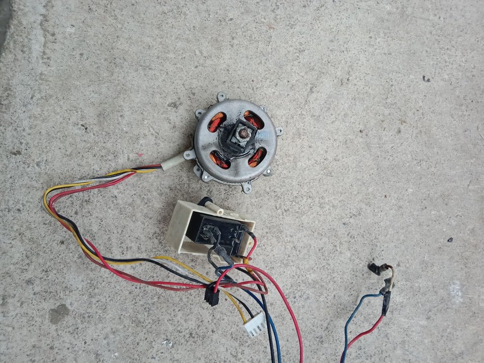 Bakır sarımlı gri fan motoru ve elektrik kabloları beton zemin üzerinde yer alıyor. ⚙️