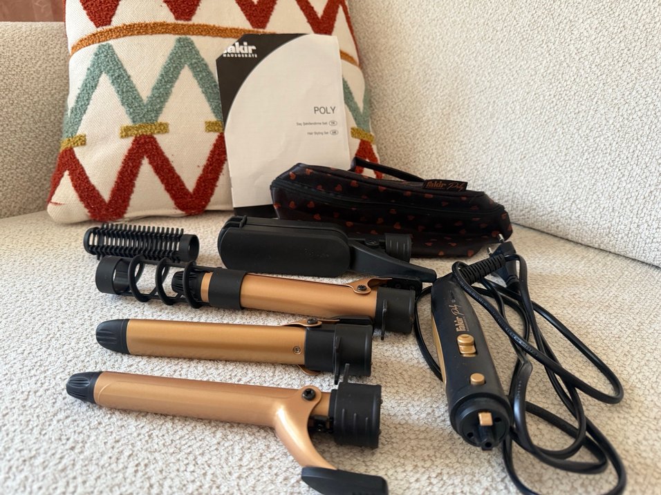 Üç adet camel renkli saç maşası ve koyu renk detaylı taşıma çantası içeren saç şekillendirici set. "POLY" etiketi bulunur. ✨