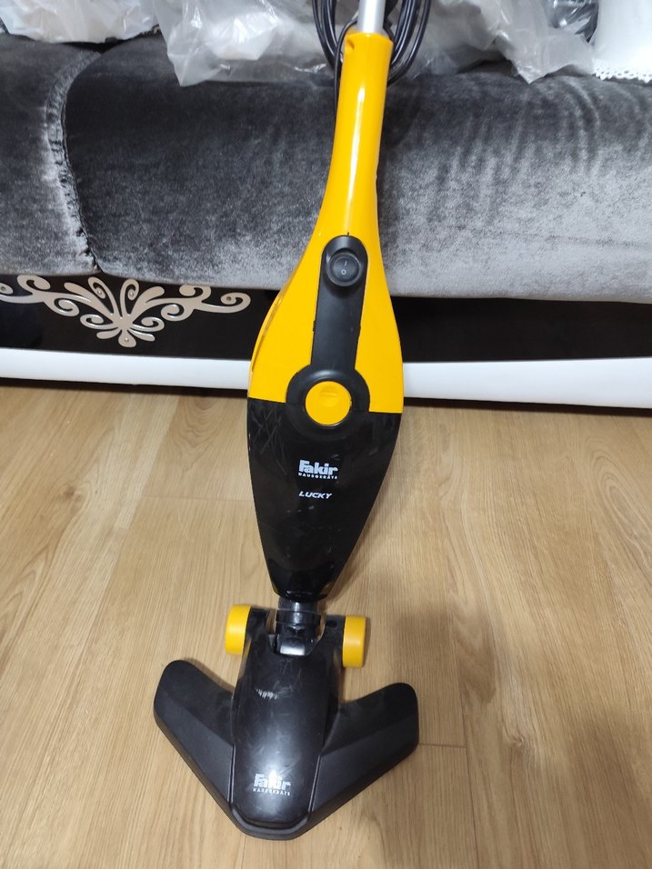 Fakir sarı elektrikli süpürge, kompakt ve dik yapısı ile kolay kullanım sağlar. Döner başlığı sayesinde manevra kabiliyeti yüksektir.