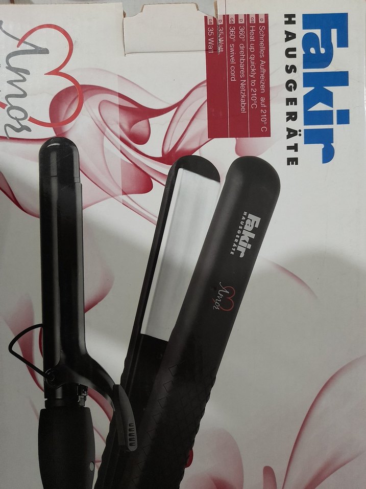 Fakir Amos saç düzleştirici, siyah renkte, 120-210°C arası ayarlanabilir ısı ve 35 watt güç sunar. Saç şekillendirmek için uygundur. ⚫