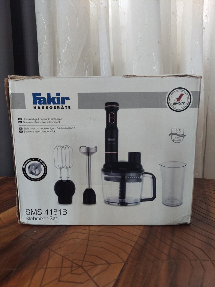 Fakir SMS 4181B siyah el blender seti, paslanmaz çelik blender çubuğu, çırpıcı, doğrayıcı kabı ve ölçü kabı içerir. 1,5 litre kapasitelidir.
