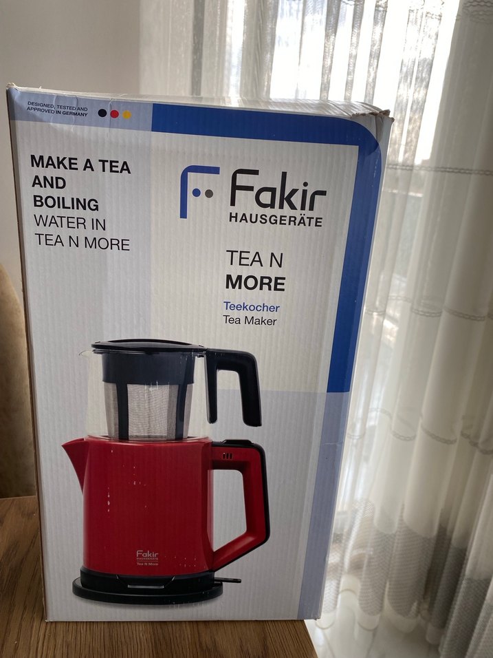 Fakir Tea N More kırmızı çay makinesi, gri kapak ve kulpla birlikte su kaynatma ve çay demleme işlemi için uygundur. İçinde demliği vardır.