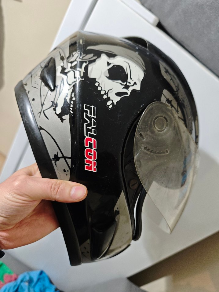 FALCON markalı siyah biker kask, baskılı kafatası deseni ve tokalı kapama özelliğiyle dikkat çekiyor. Plastik malzemeden üretilmiş, grunge punk tarzını yansıtıyor. Şeffaf vizör koruma sağlıyor. ️