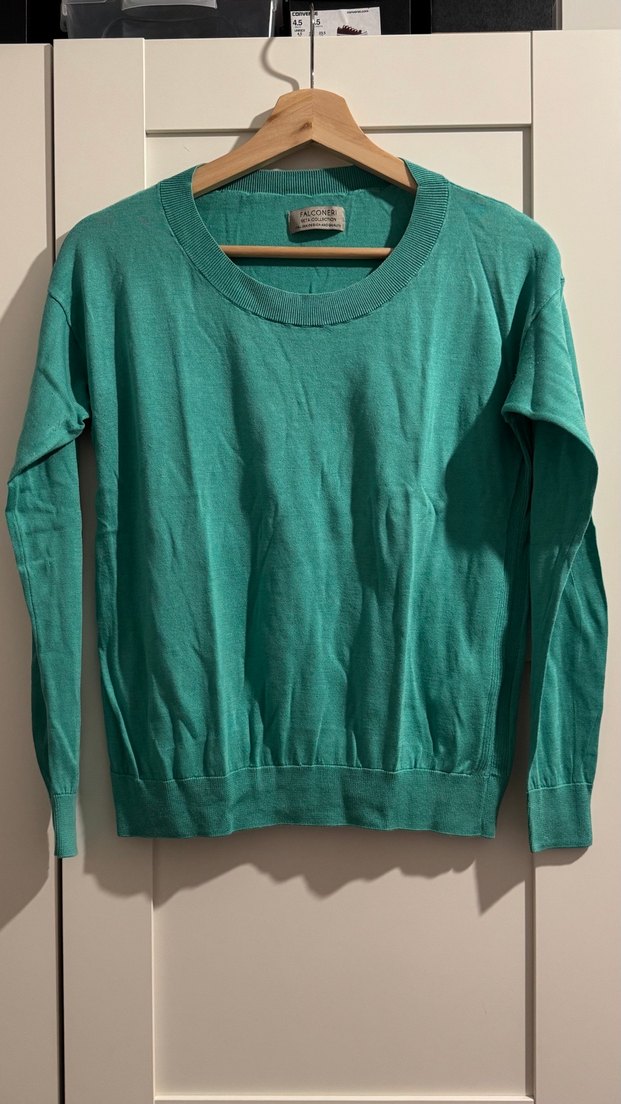 Turkuaz renkli, bisiklet yaka ve uzun kollu kadın keten kazak. Gevşek kesimi ve sade tasarımıyla günlük kullanıma uygundur.